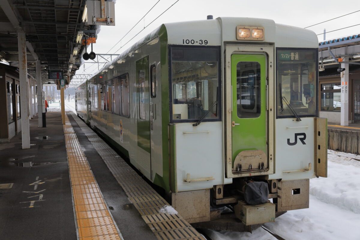 3日目は、北上線の横手行きからスタート。キハ100系2両編成の車内には、ほっとゆだ駅近くにある高校へ向かう学生さんがそこそこ乗っていました。
