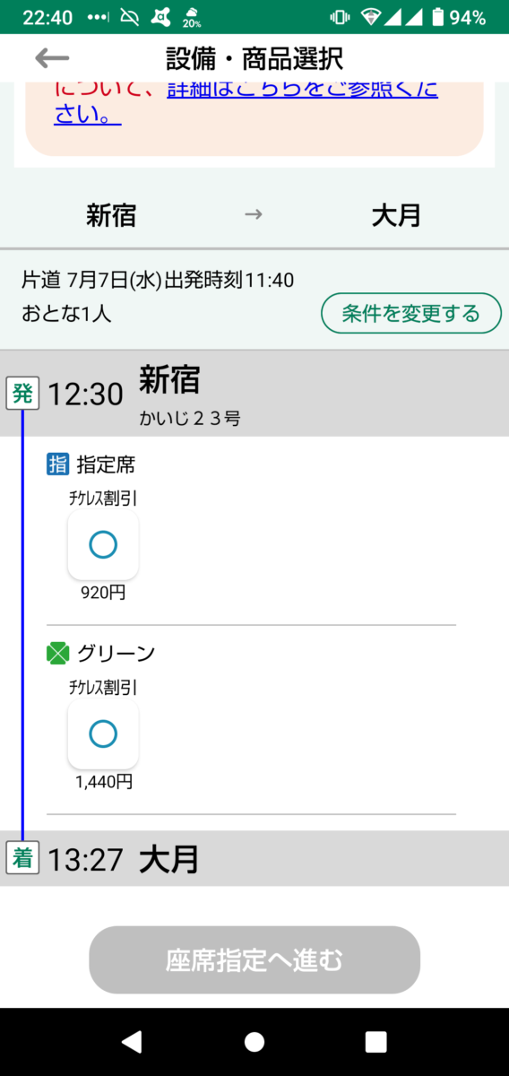 ここで、「チケットレス割引」と表示されているボタンが「在来線チケットレス特急券」に対応しますので、これをタップします。
