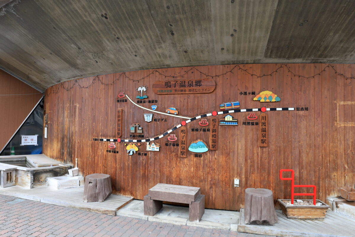 鳴子温泉駅の駅舎の壁には、鳴子温泉峡の案内図が大きく描かれています。そして、この両側に、小さいですが足湯もあります。列車待ちの間に、気軽に足湯を楽しめますね。