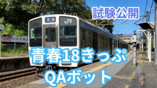 青春18きっぷ 【試験公開】「青春18きっぷQAボット」を公開しました! 青春18きっぷに関する質問にAIが答えてくれる「青春18きっぷQAボット」を試験公開しました。当サイト「青春18きっぷナビ」の記事をAIに学習させ、その内容を元にAIが回答を生成してくれます。今のところ、回答の精度はイマイチですが、リファレ... 2024.03.04 青春18きっぷ