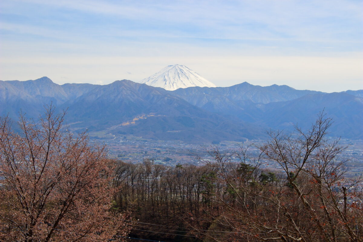 タクシーを降りたのはバス停の近く。ここからの景色もなかなかのもので、甲府盆地を一望できます。富士山も見えてはいますが、雪をまとった富士山は、背景の灰色の雲に沈みがちです。